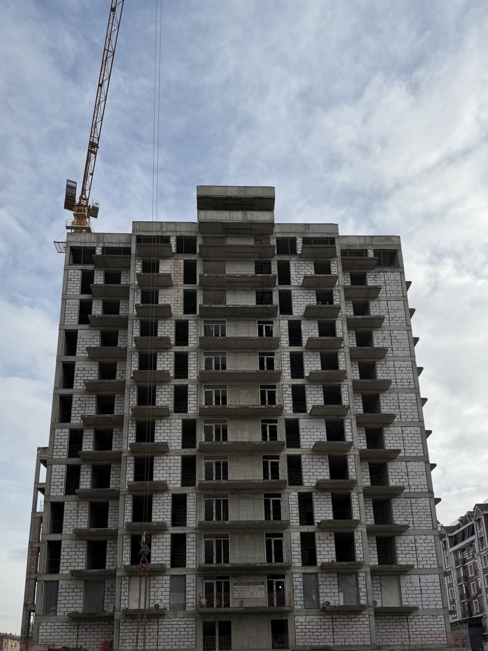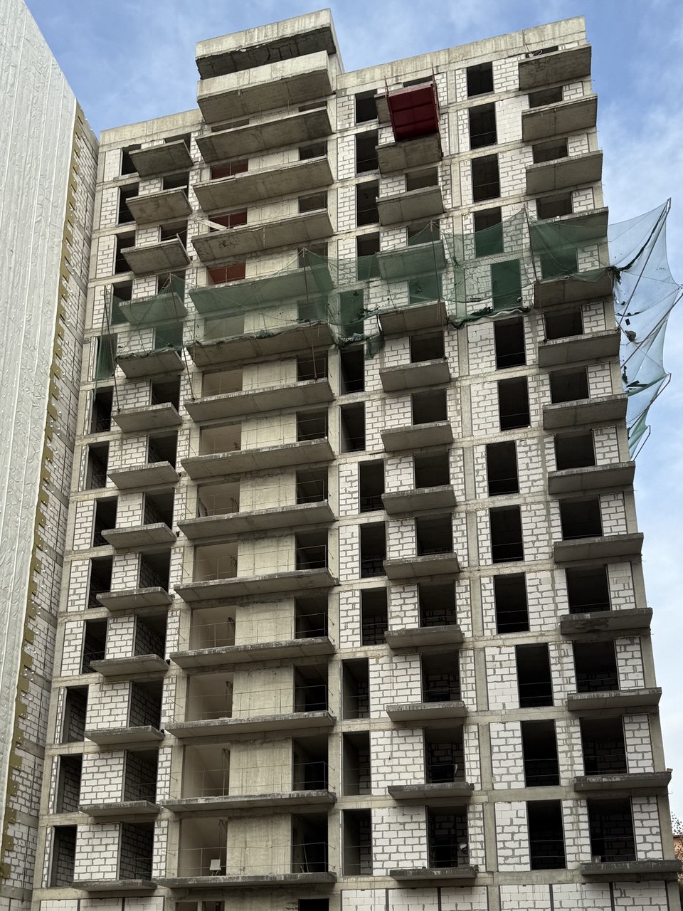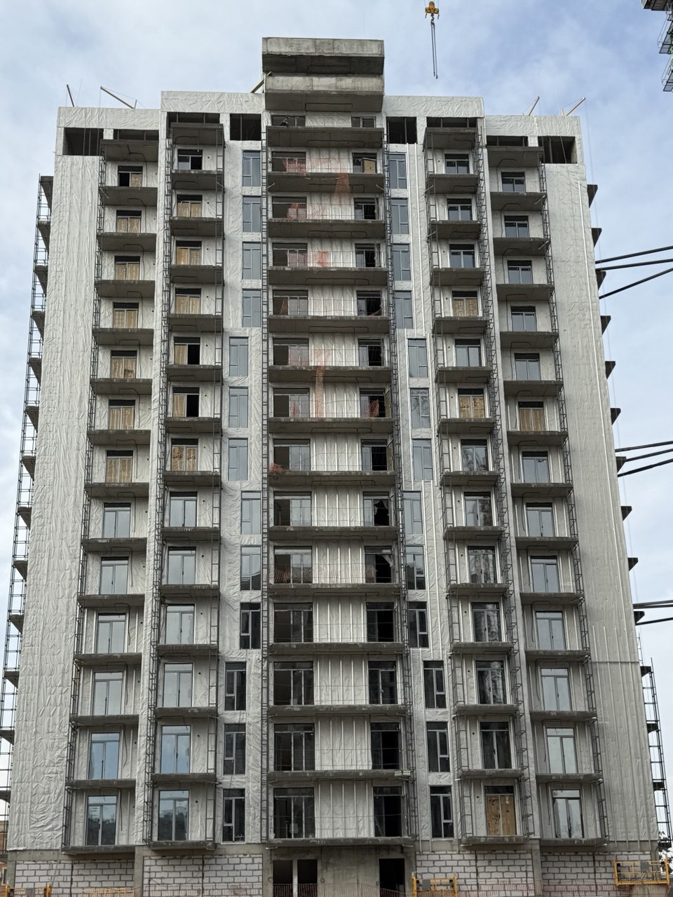 Фасад — закончены работы по утеплению, монтажу фасадного профиля. Начат монтаж керамогранита. Блок Г, фасад в сторону улицы Сайхун.